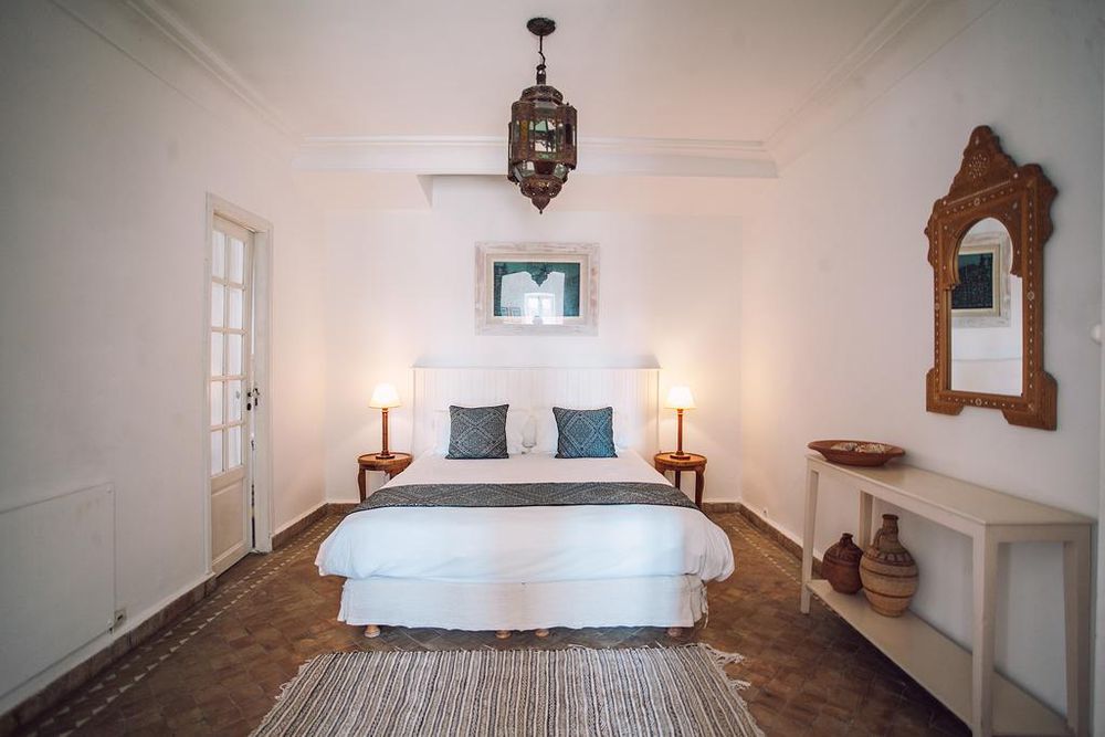 La Villa Maroc is located in Essaouira's medina, just beyond the city walls and two minutes from the beach. The riad consists of four original renovated houses from the 18th century. Small salons with fireplaces, patios, and rooms arranged with love and exclusivity await you. All are individually furnished and create a pleasant family atmosphere. The La Villa Maroc Riad has two boutiques, seven different salons, and four of them with fireplaces. On the large roof terrace with a fantastic view of the old town and the sea, you can have both breakfast and dinner. You can refresh yourself on the beach or in the private swimming pool, which is available for hotel guests. The total of 20 rooms and suites are characterized by their classic comfort and stylish decor. Antique furniture, beautiful carpets, pictures, and mirrors as well as many paintings provide exclusive and charming ambience. In addition to the beautiful double rooms, superior rooms with additional sitting area await you. In the exclusive suites for two to a maximum of four people you have a separate salon and partial sea view. The Oriental Spa pampers you with oriental beauty care, hamam, and massages.