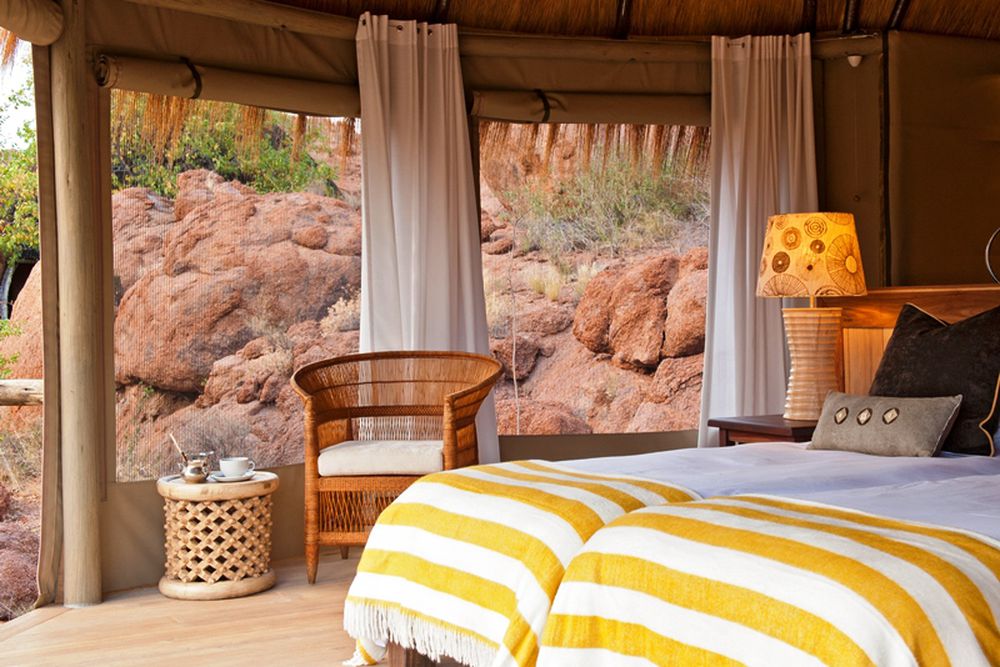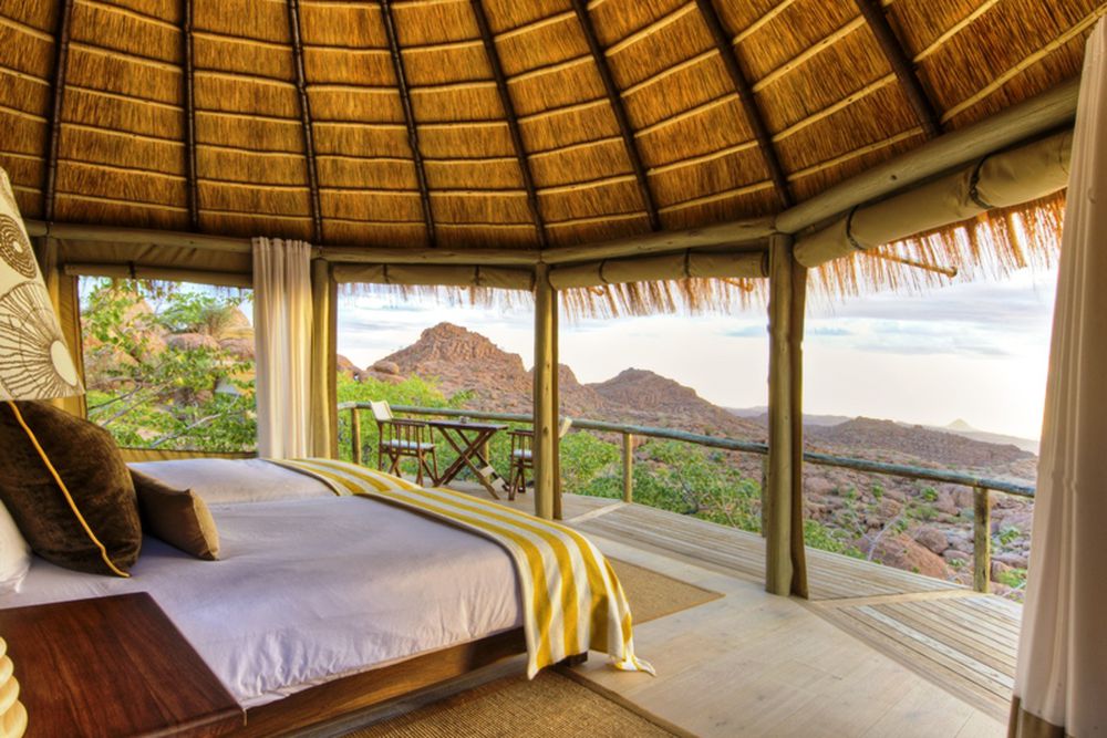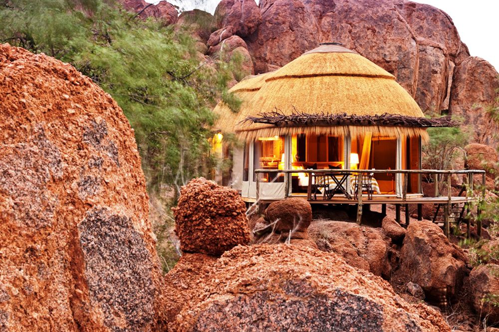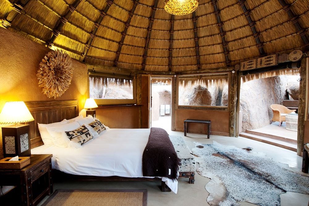 The rooms of Mowani Mountain Lodge are secluded amidst the stone cliffs, laid out like an African village. The design of the rooms is inspired by their surroundings, as elegance and earth colors are also reflected in the interior. Thanks to this design, the lodge is the winner of a German architecture eco-design award.