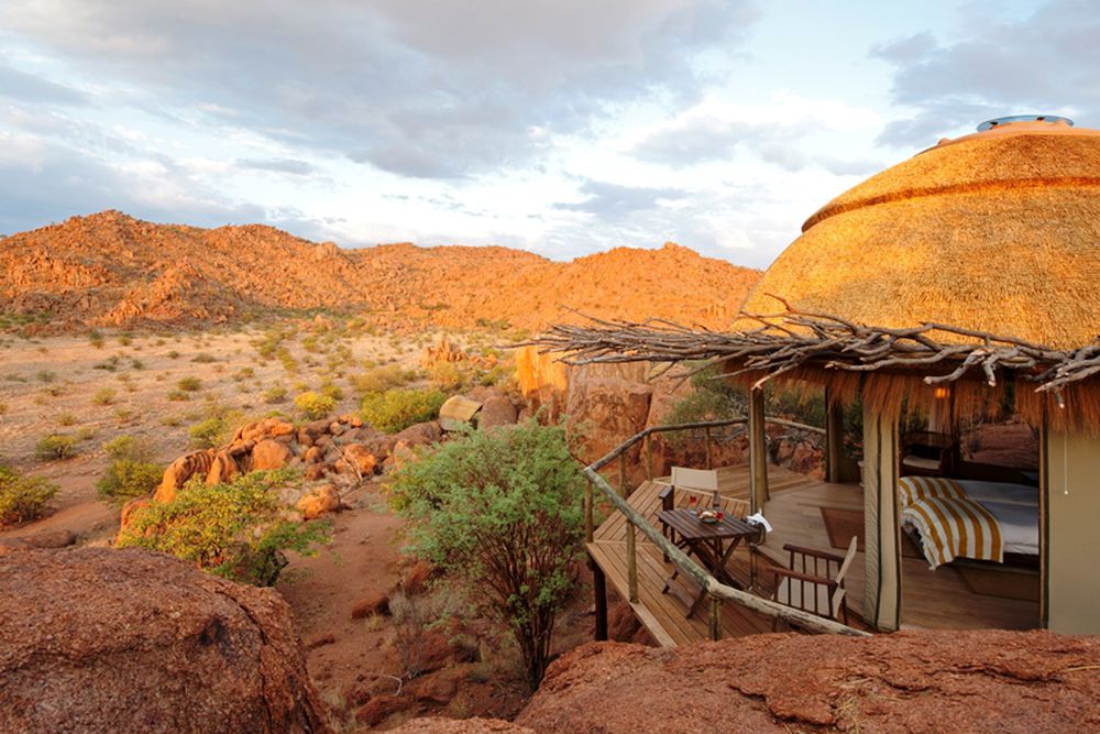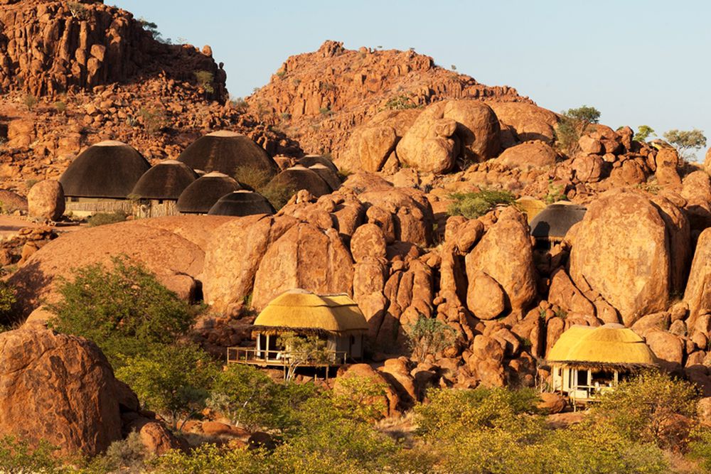Located between Ugab and the Huab River in the south of Damaraland, Mowani Mountain Lodge is set in endless untouched wilderness with fascinating desert landscapes. Since it is built into the rock, it is difficult to spot it from a distance.