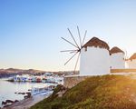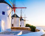 Snow-white windmills adorn a small hill in Mykonos and are the most eye-catching sights of the island.