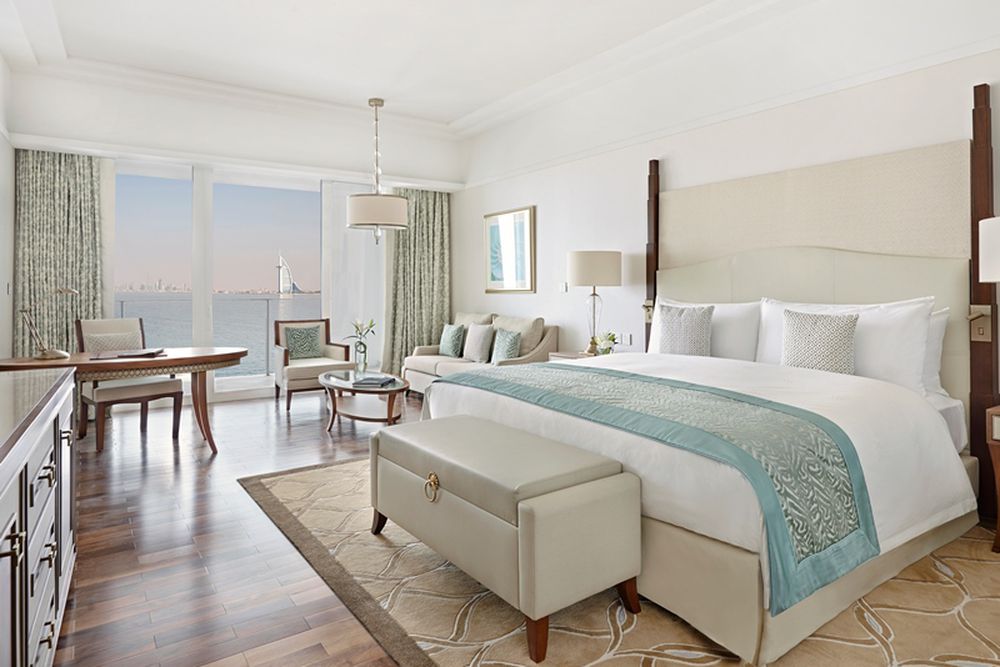 King Premier Club Room - approx. 52 m², with a view of the artificial island or the Dubai skyline and located on floors 3 - 5. You will have access to the Club Lounge (open between 07:00-23:00), free snacks, and a selection of soft drinks is available. You can enjoy breakfast in the lounge or the Mezzerie restaurant (during Ramadan only in the Mezzerie restaurant). Maximum 2 adults + 2 children (0-11 years old) or 3 adults.