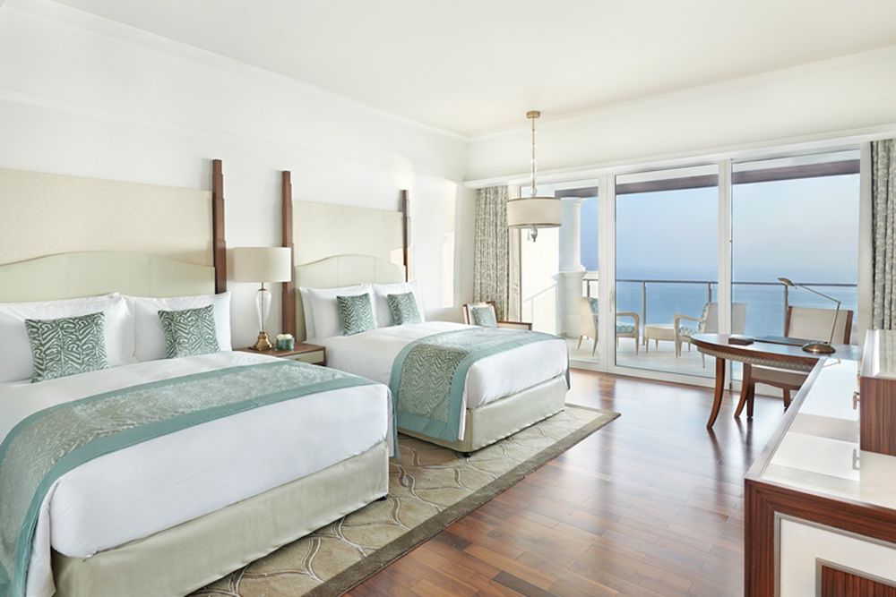 King Deluxe Skyline Sea View - approx. 52 m², with two queen-sized beds or one king-size bed, view of the Arabian Gulf and/or the skyline of Dubai. Maximum 2 adults + 2 children (0-11 years old) or 3 adults.