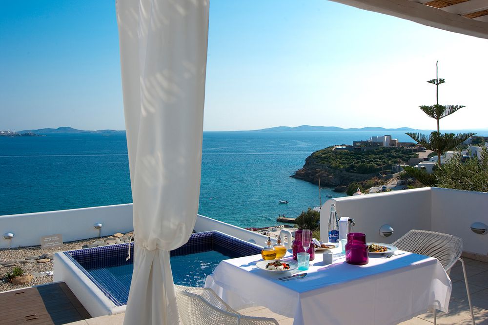 Honeymoon Suite (33 sqm) —On the top floor overlooking the beach and Mykonos town, these beautiful suites have a roof terrace with a plunge pool, living area and a second terrace. For a maximum of 2 adults.