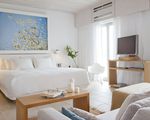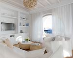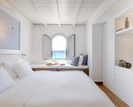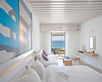 Junior Suite (28 sqm)— Spacious room with additional couch that transforms into a guest bed and a lovely balcony overlooking stunning westward views to the sea and the town of Mykonos. For a maximum of 3 adults or 2 adults and 2 children up to 11 years.