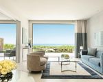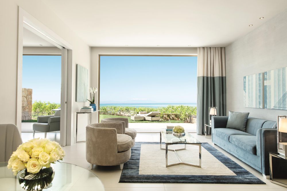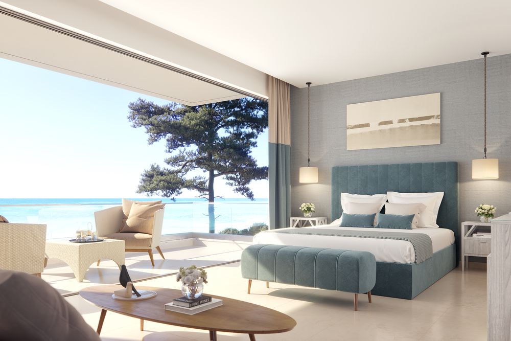 The 253 modern bungalows offer plenty of space to relax in alluring shades of blue and white. Thanks to the floor-to-ceiling windows, your stay guarantees uninterrupted views of the Aegean Sea and the green gardens.