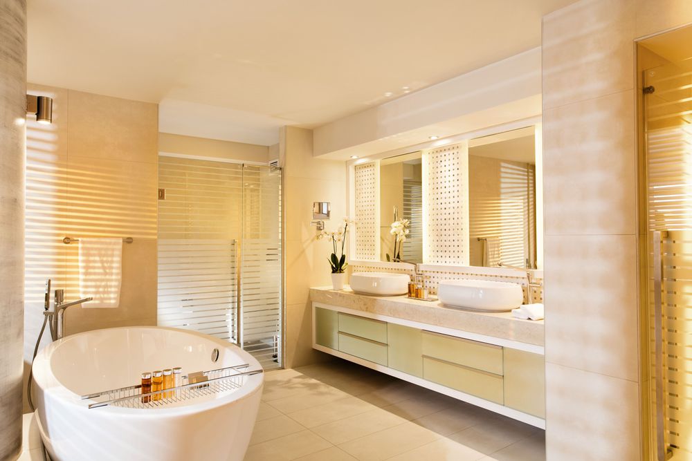 The spacious bathrooms have a bathtub and a shower.