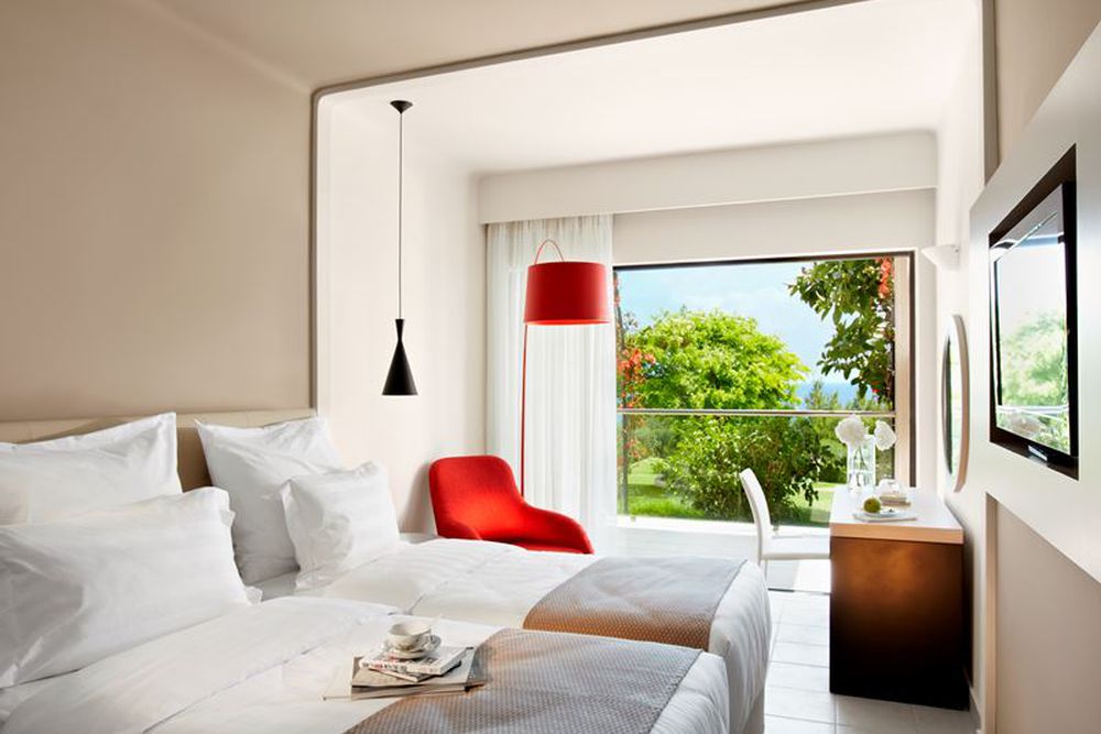 Nestled amidst the gardens, the luxury accommodation in Corfu, Greece provides a fine selection of 384 Ionian sea view hotel rooms and suites, all offering magnificent panoramic views of the Ionian Sea while exuding an aura of serenity. The lavish amenities include a queen-size bed, private furnished balcony or terrace and bathroom with a bathtub or shower.