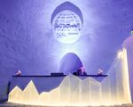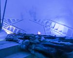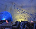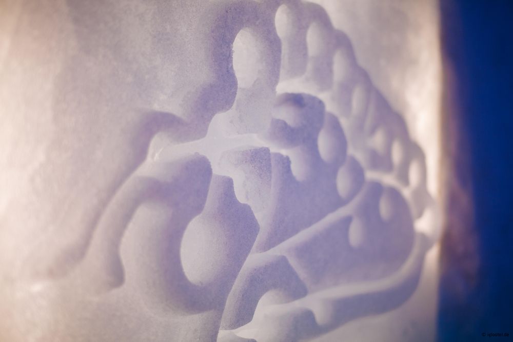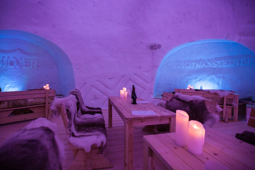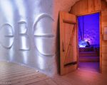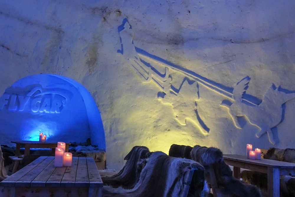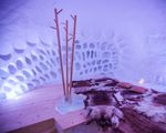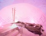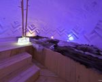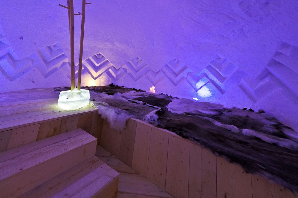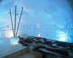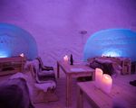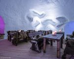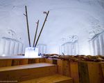 In the lounge area, ice carvings decorate the walls.
