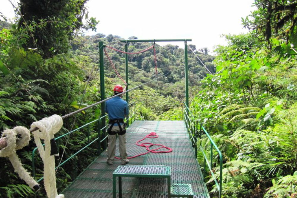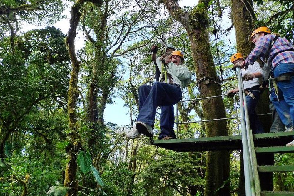 The Sky Tram gondolas glide gently through the rainforest, giving you unforgettable views of the landscape as you work your way up the mountain. This tour is perfect for those who want a different type of exploration tour without much physical effort. A relaxed excursion in large gondolas that caters to all ages and abilities, acommodating of the physically challenged, allows you to reach a height of 1400 \ - 1600 meters. Have you charged your camera? Use the gondola ride to capture beautiful and unique nature spectacles. If you spot something rushing by the trees or rustling amidst the treetops, it's probably one of the **many exotic animals ** in the rainforest. At the top, expect a beautiful view of the volcanoes from Arenal, Tenorio, Maravalles and Orosi, as well as the Nicoya Golf and the golden landscapes of Guanacaste when the sky is clear enough. Your nerves and the urge for adventure are put to the test on the Sky Trek. A series of wire ropes, where you fly through the forest with the Zipline like a bird, is waiting for you. Feel the adrenaline and cool airstream as you fly through the treetops and see the cloud forest from a perspective that only birds do. When it comes to safety, you do not have to worry, because only the latest high quality materials are used so you can experience a comfortable flight through the Rainforest. Buckle up your belt and put the helmet and gloves on, get some momentum and jump from the platform high above the trees. Let's start the fast ride, where you see the landscape fly by in a rush of speed.